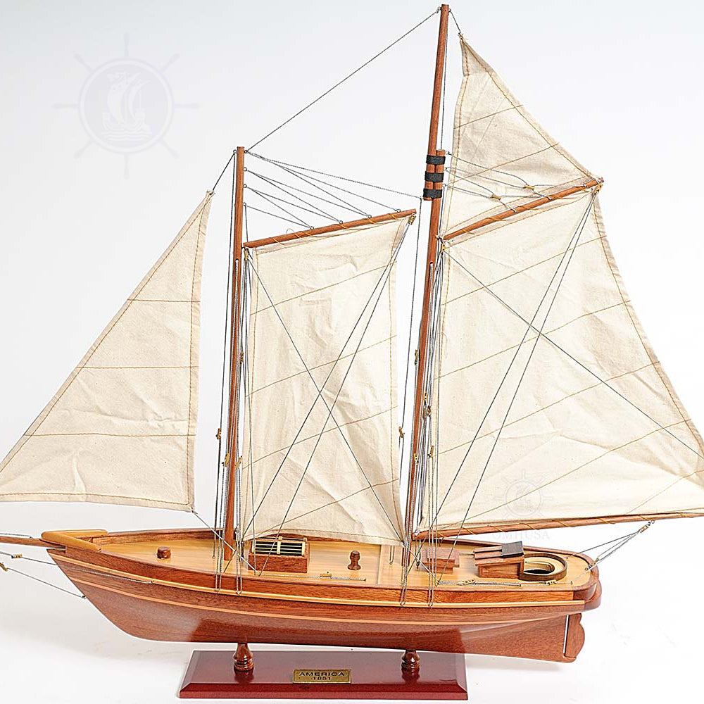 19th century racing yacht America was given its name after the first international sailing trophy that it won - the America’s Cup. This handmade model is built plank on frame from cherry wood by master craftsmen in accordance with original plans, pictures, and drawings. Features include three main masts with fabric sails and hand-stitching, bowsprit, tiller, wooden bunkers, and an exquisitely varnished hull in natural grain. A wooden stand with nameplate bearing the name of "America 1851" is included. Light assembly is required as the masts are folded flat down in shipping.