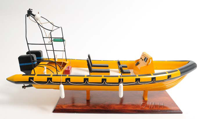 This model faithfully captures the distinctive features of the Ribcraft inflatable boat, including the bold inflatable collar, open deck layout, structured safety rails, functional seating arrangement, and detailed console and equipment. The vivid color scheme and clean, purposeful lines reflect the boat’s utilitarian yet powerful character, while the polished wooden display base adds elegance and presence.