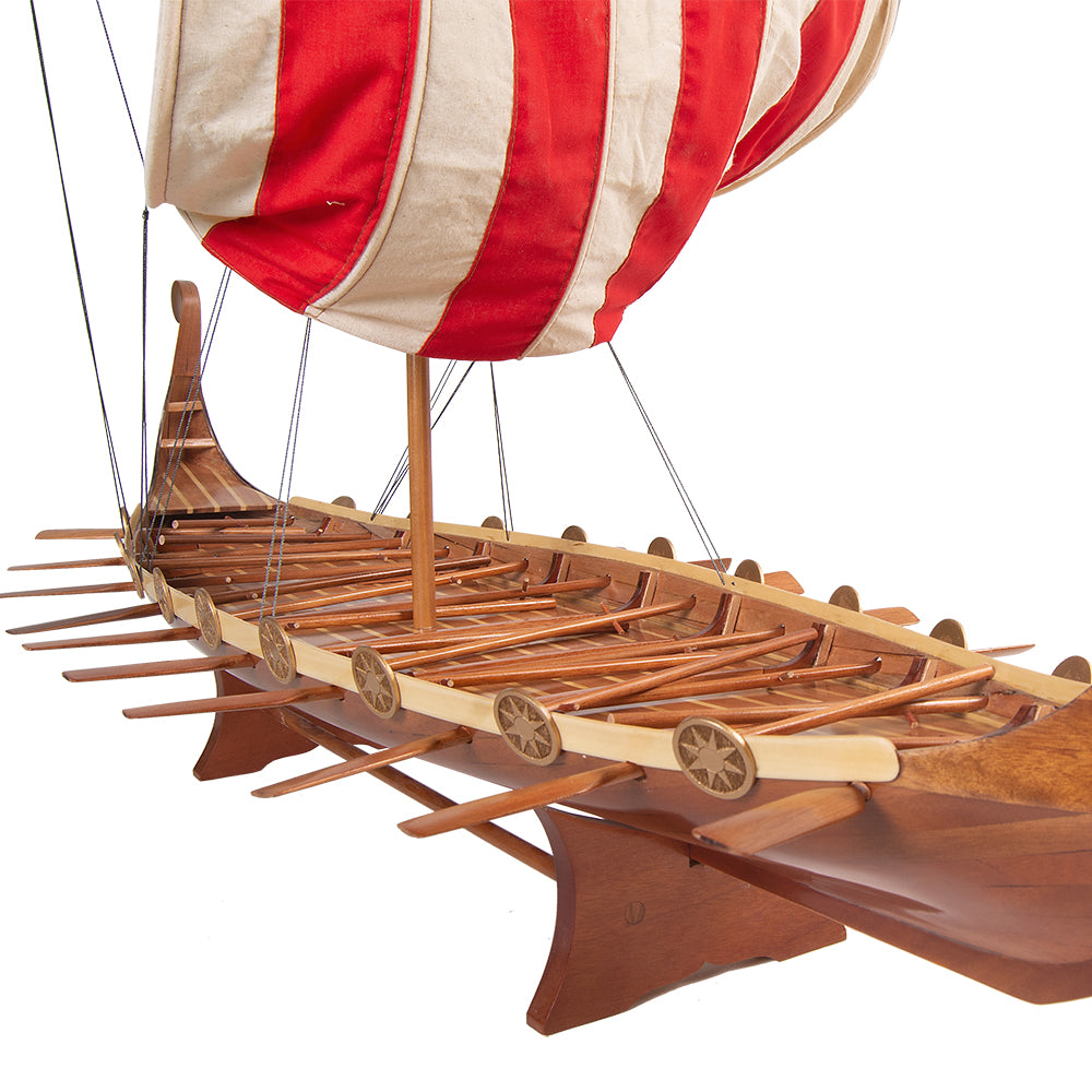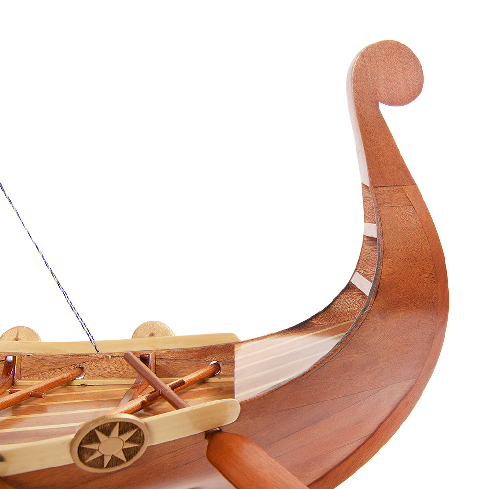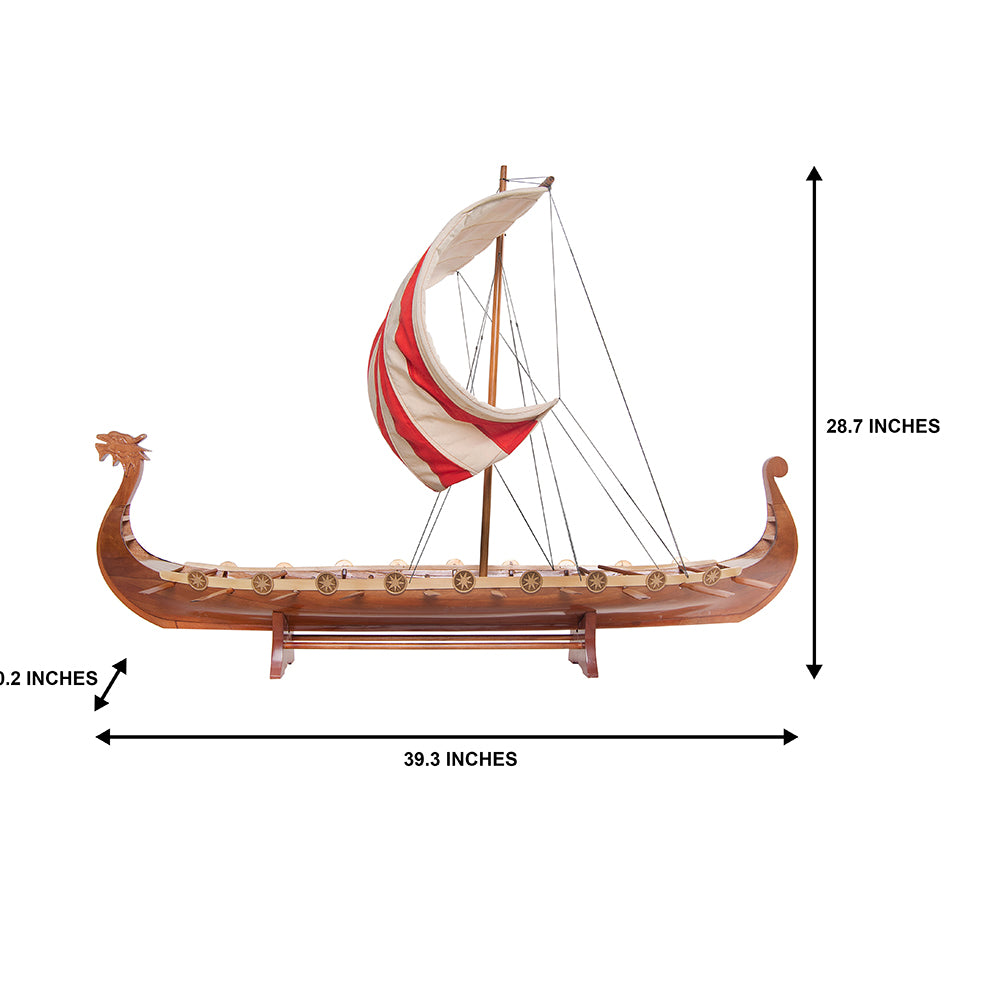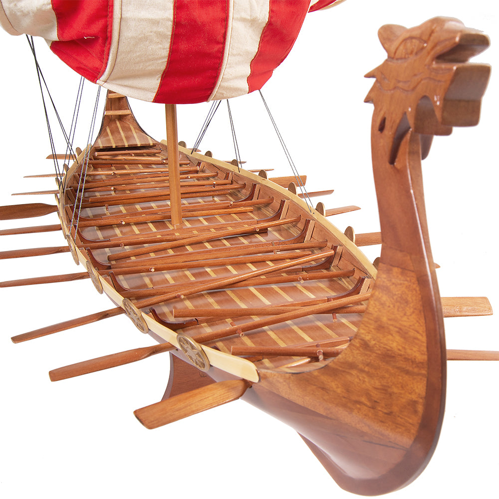 The model features a fully detailed deck, including a central mast, shields along the sides, and a miniature dragon-headed prow that evokes the spirit of Viking exploration. Intricate rigging and hand-sewn sails complete the realism, allowing you to admire the vessel from every angle.