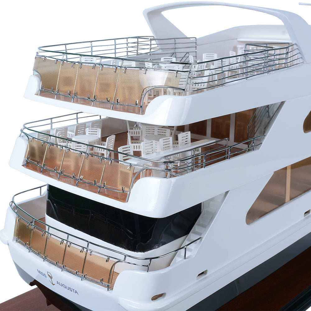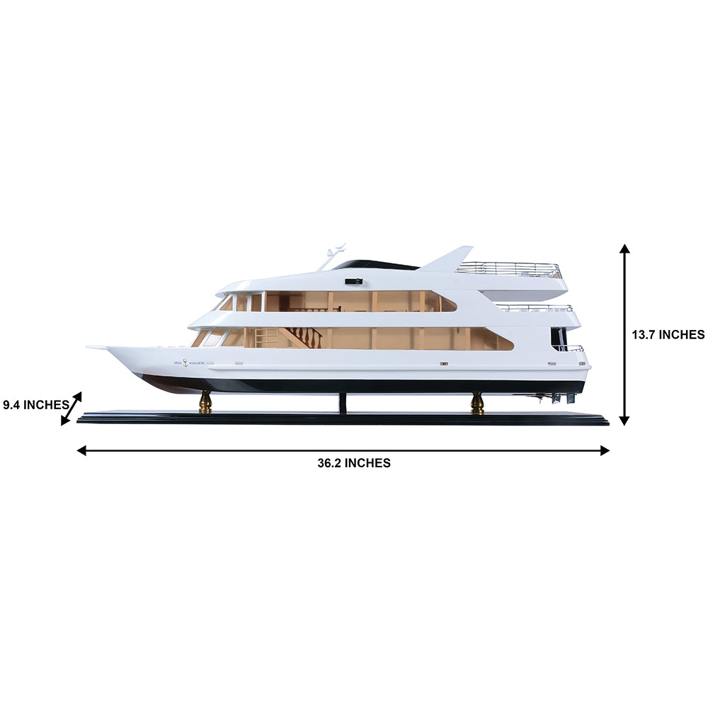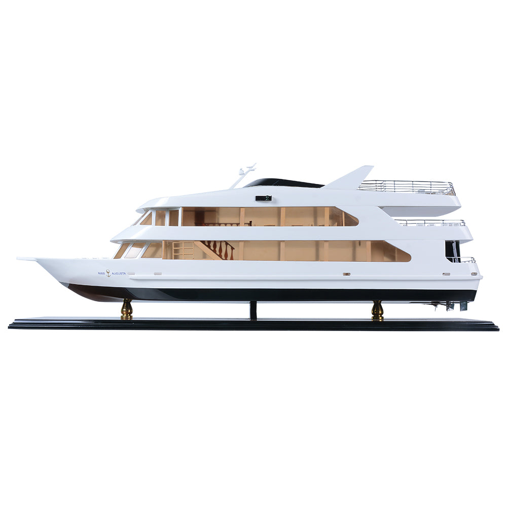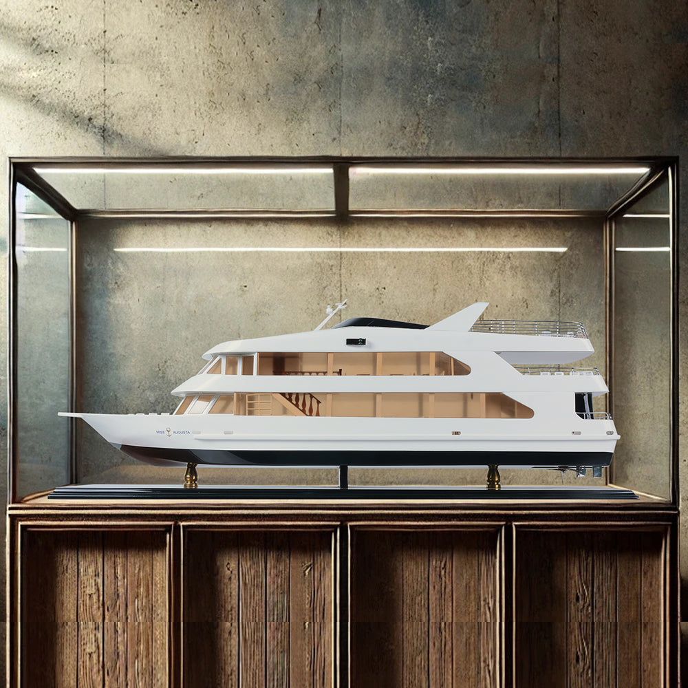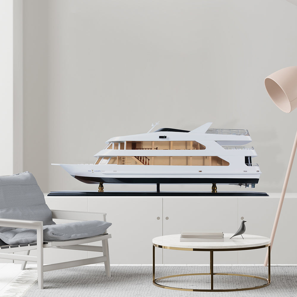 The Miss Augusta 36-inch model is a beautifully crafted miniature yacht that captures the sleek elegance and contemporary styling of the original vessel. Featuring a smooth white superstructure contrasted by a deep, dark hull, the model reflects the modern luxury and refined performance of today’s premium leisure cruisers.