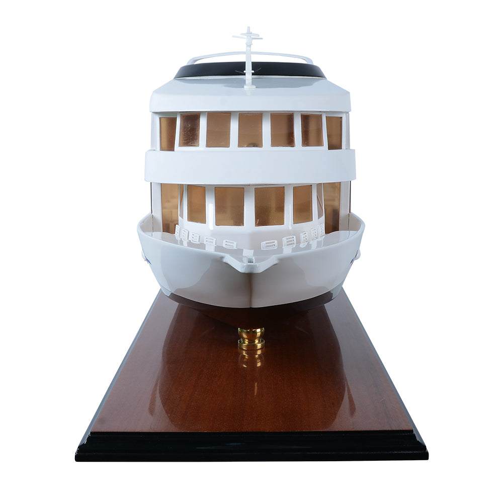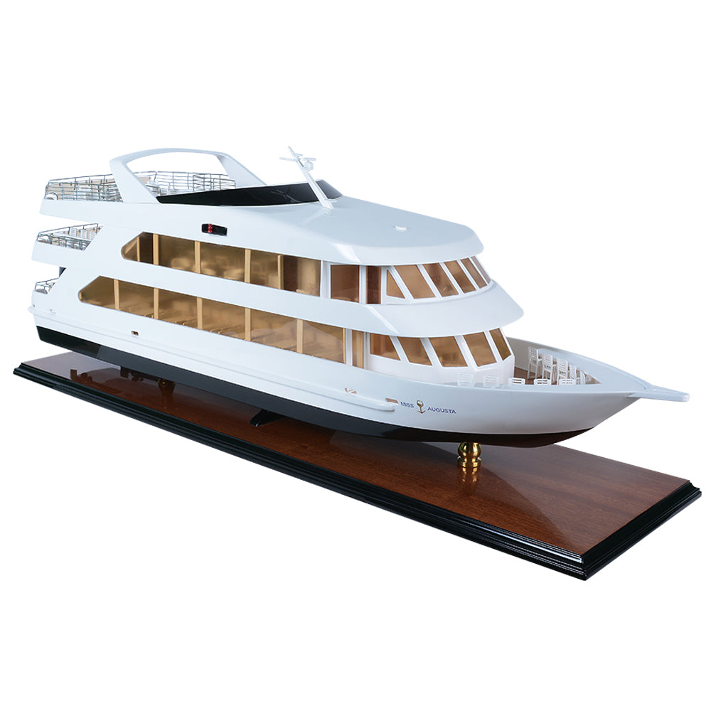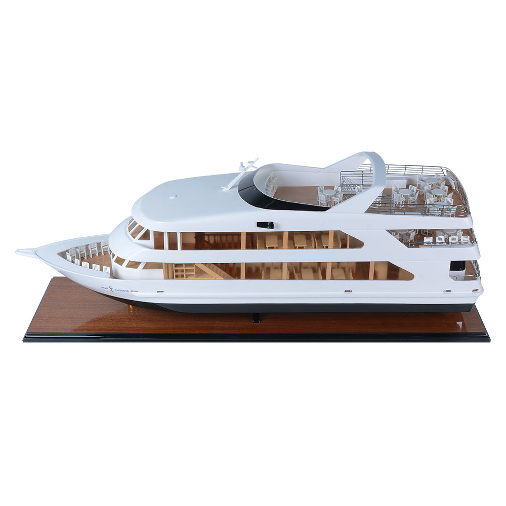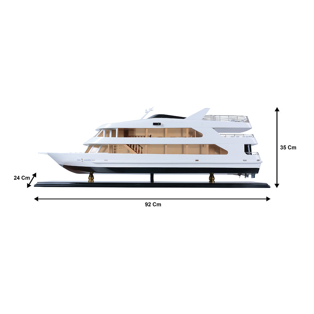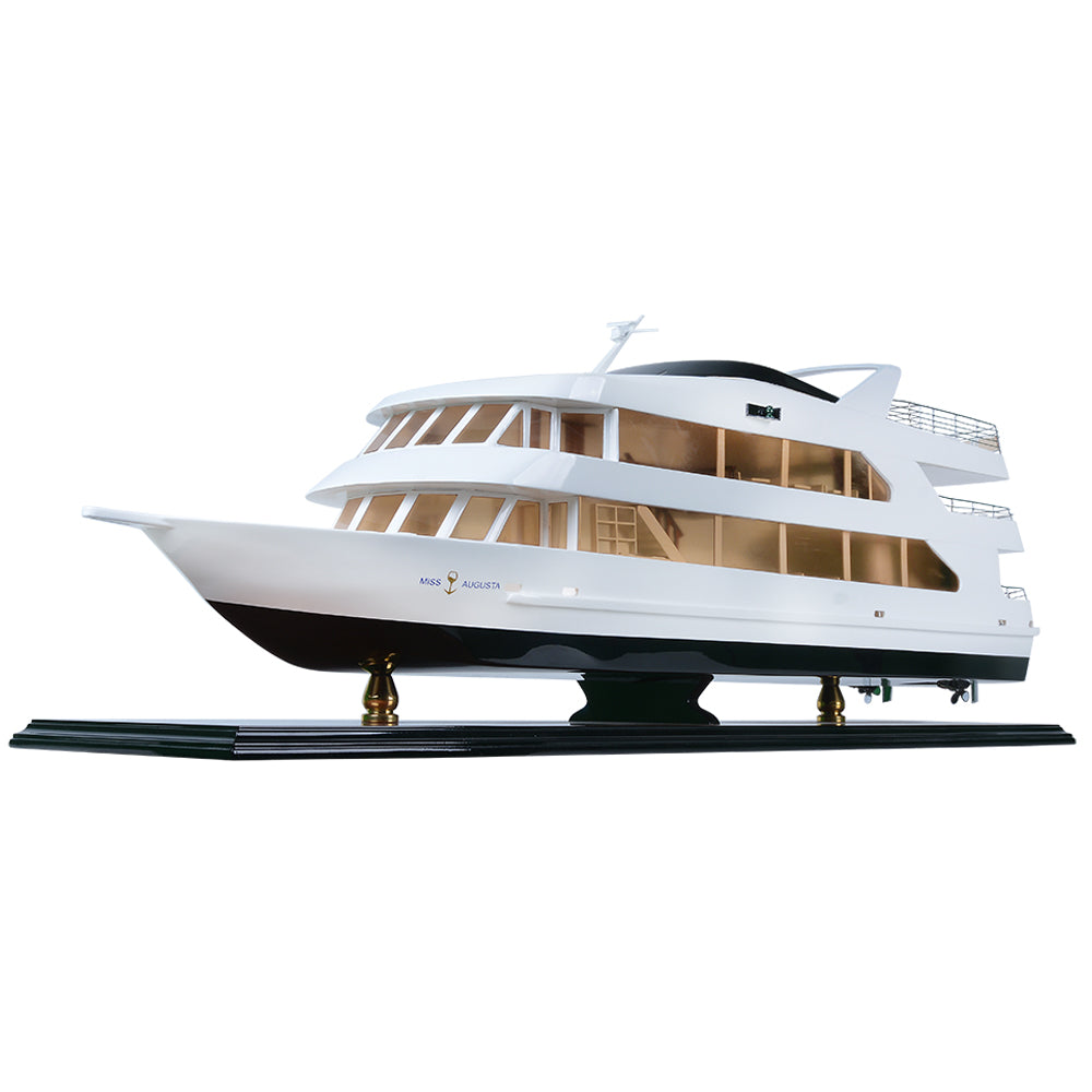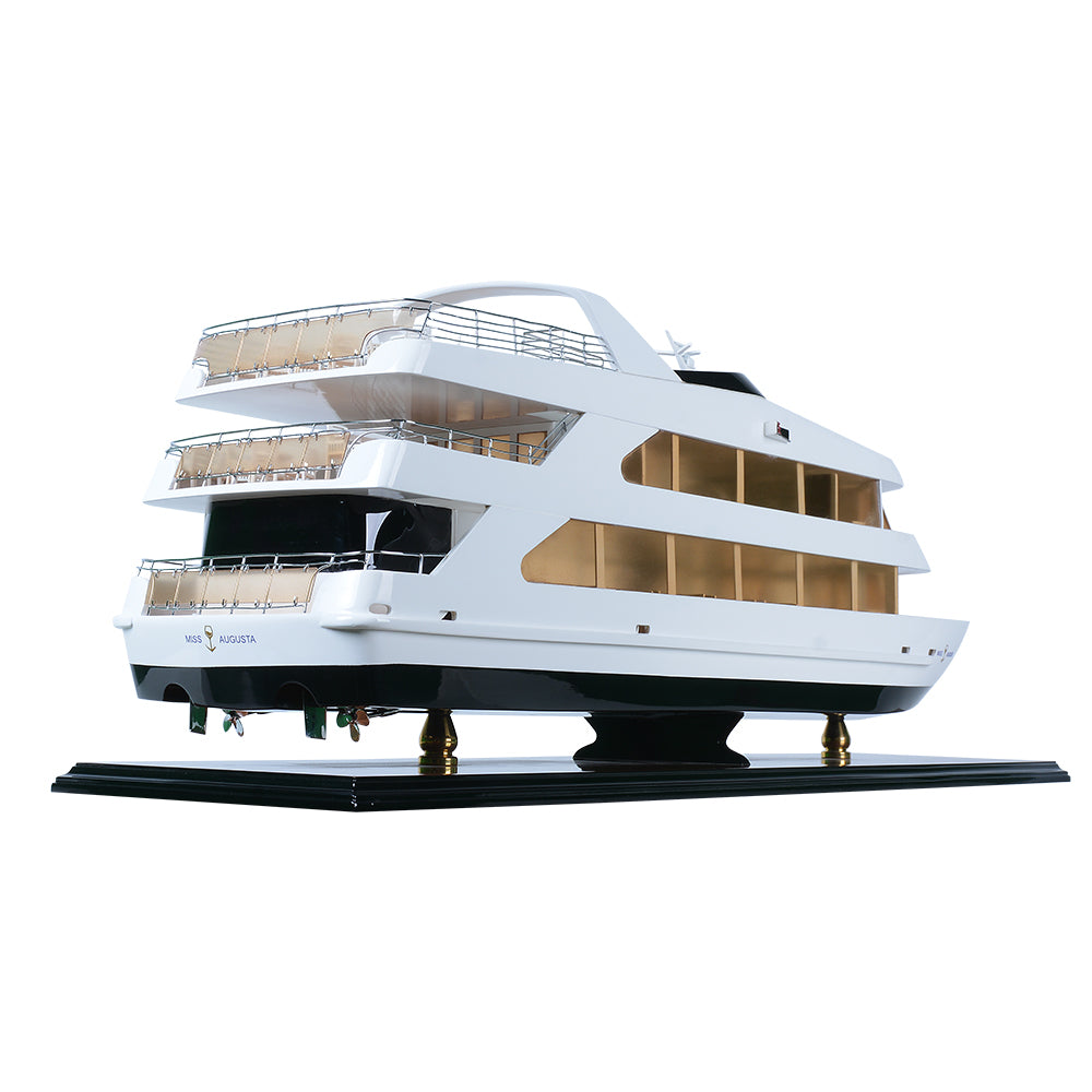 The Miss Augusta 36-inch model is a beautifully crafted miniature yacht that captures the sleek elegance and contemporary styling of the original vessel. Featuring a smooth white superstructure contrasted by a deep, dark hull, the model reflects the modern luxury and refined performance of today’s premium leisure cruisers.