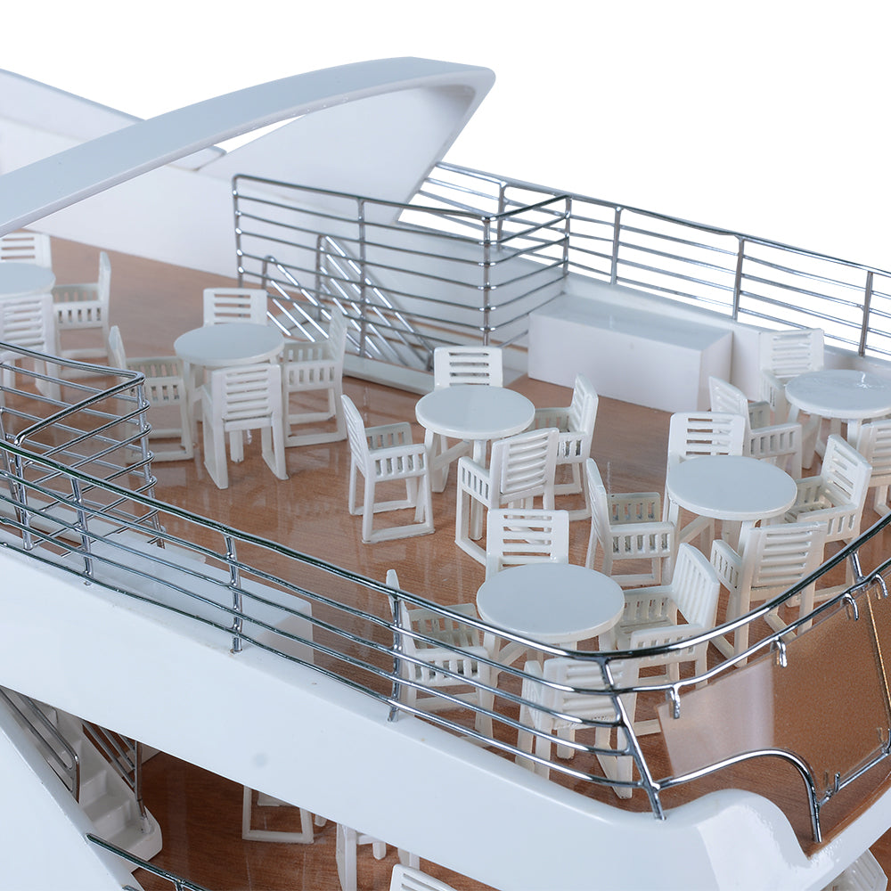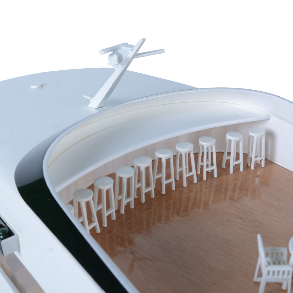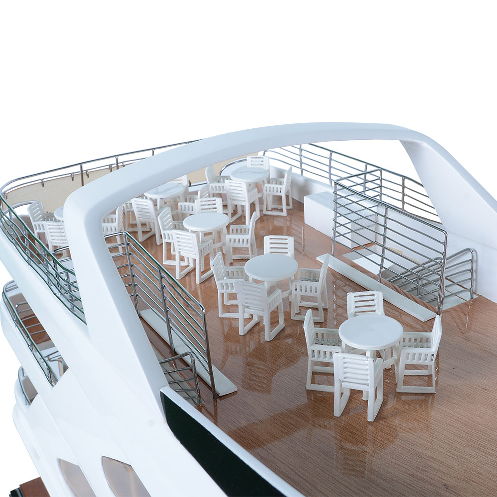 Hand-built from high-quality Western Red Cedar, every detail is meticulously recreated—from the open deck layout and panoramic windows to the sculpted railings and interior stairway. Its clean lines, flawless surfaces, and precise proportions showcase the sophistication of modern yacht design.