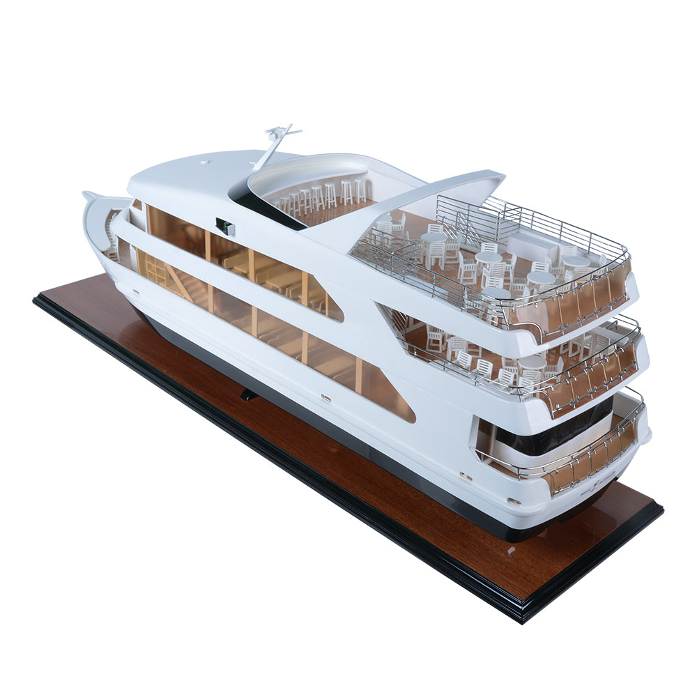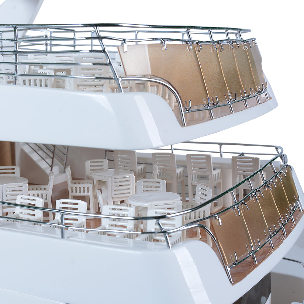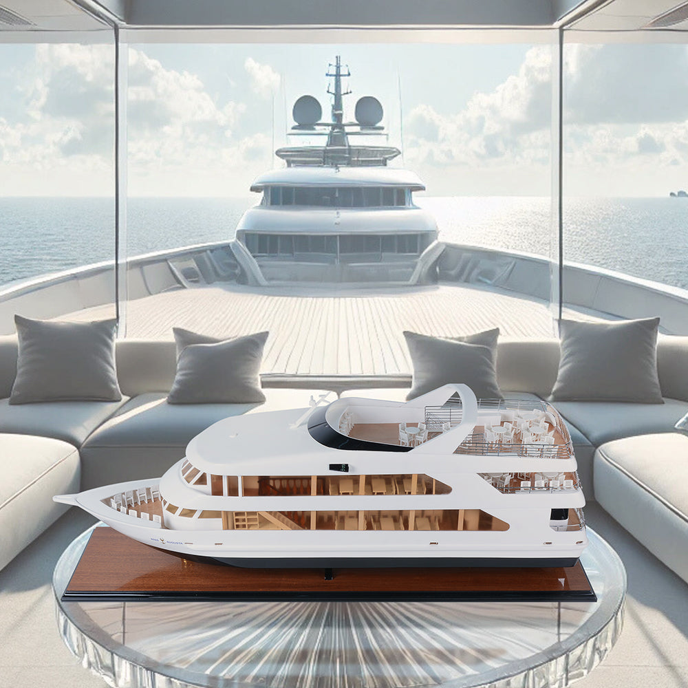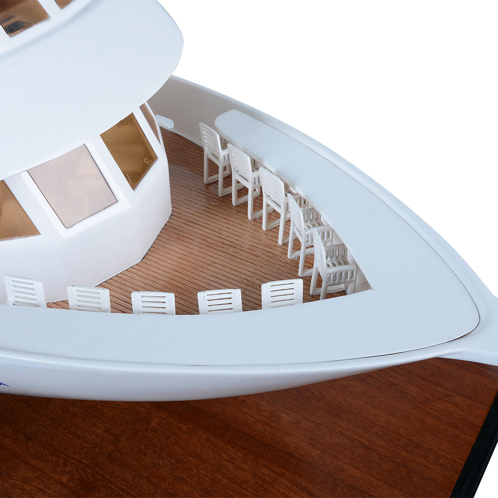 Hand-built from high-quality Western Red Cedar, every detail is meticulously recreated—from the open deck layout and panoramic windows to the sculpted railings and interior stairway. Its clean lines, flawless surfaces, and precise proportions showcase the sophistication of modern yacht design.