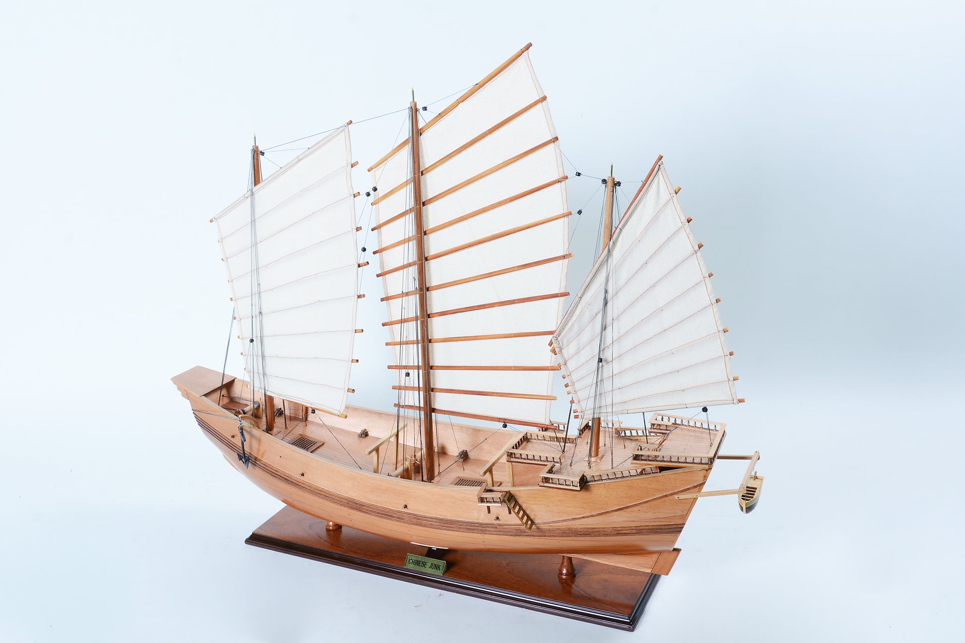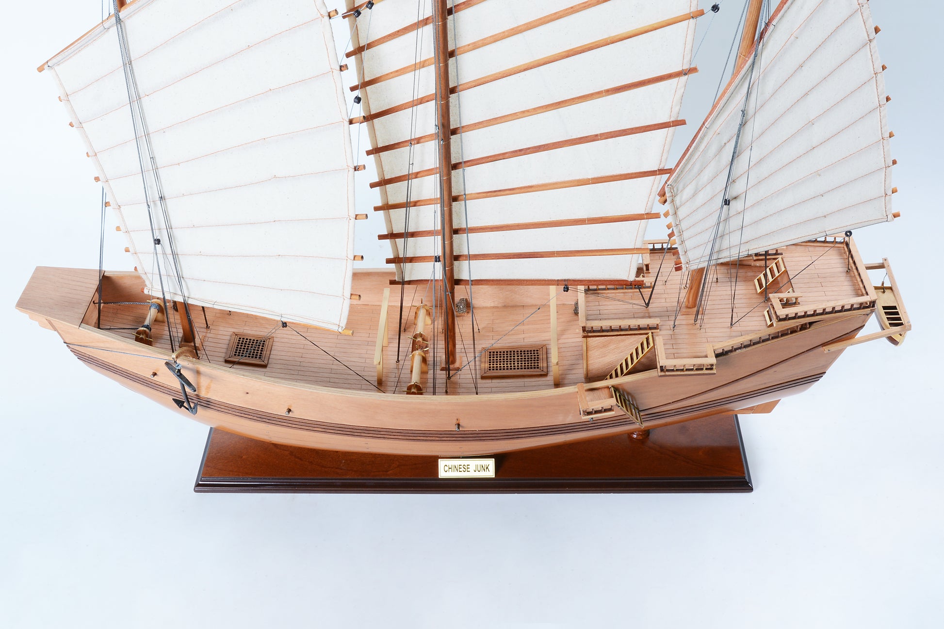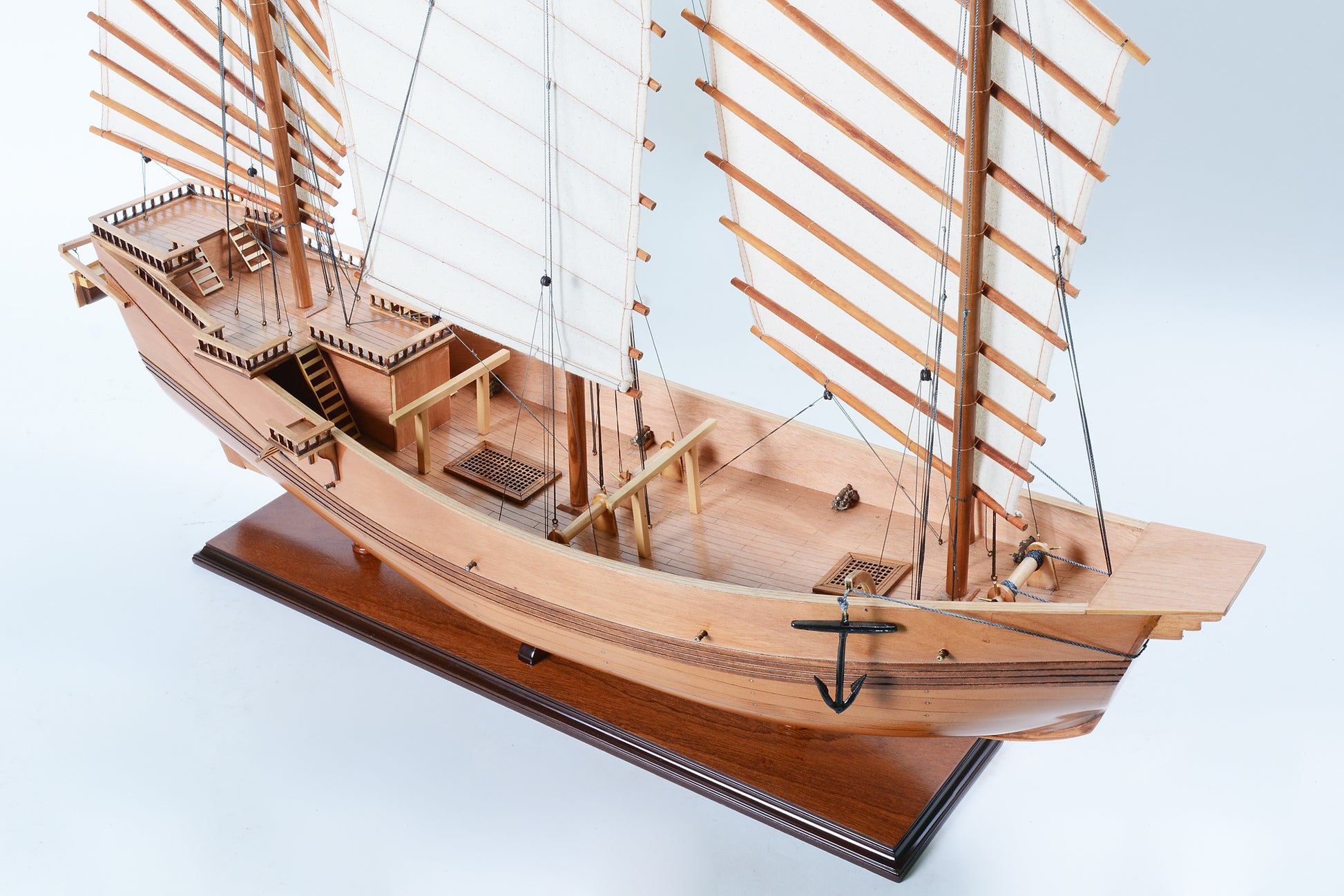 One of the most recognizable features of this model is its battened sails, traditionally made from woven fabric and supported by horizontal battens. These sails are meticulously hand-stitched and securely rigged to the masts with carefully knotted lines. The deck is thoughtfully detailed with wooden hatches, railings, cabin structures, and period-accurate fittings that bring the model to life.