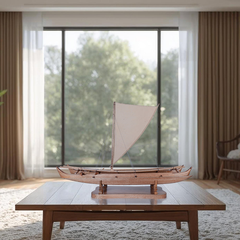 Every element—from the gentle curves of the twin hulls and the intricate lashings to the upright sail—is shaped and assembled by hand, faithfully reflecting the balance, simplicity, and ingenious functionality of the original Hawaiian outrigger canoes. The model is displayed on a wooden stand, accentuating its long, slender silhouette and the graceful rise of its bow and stern.