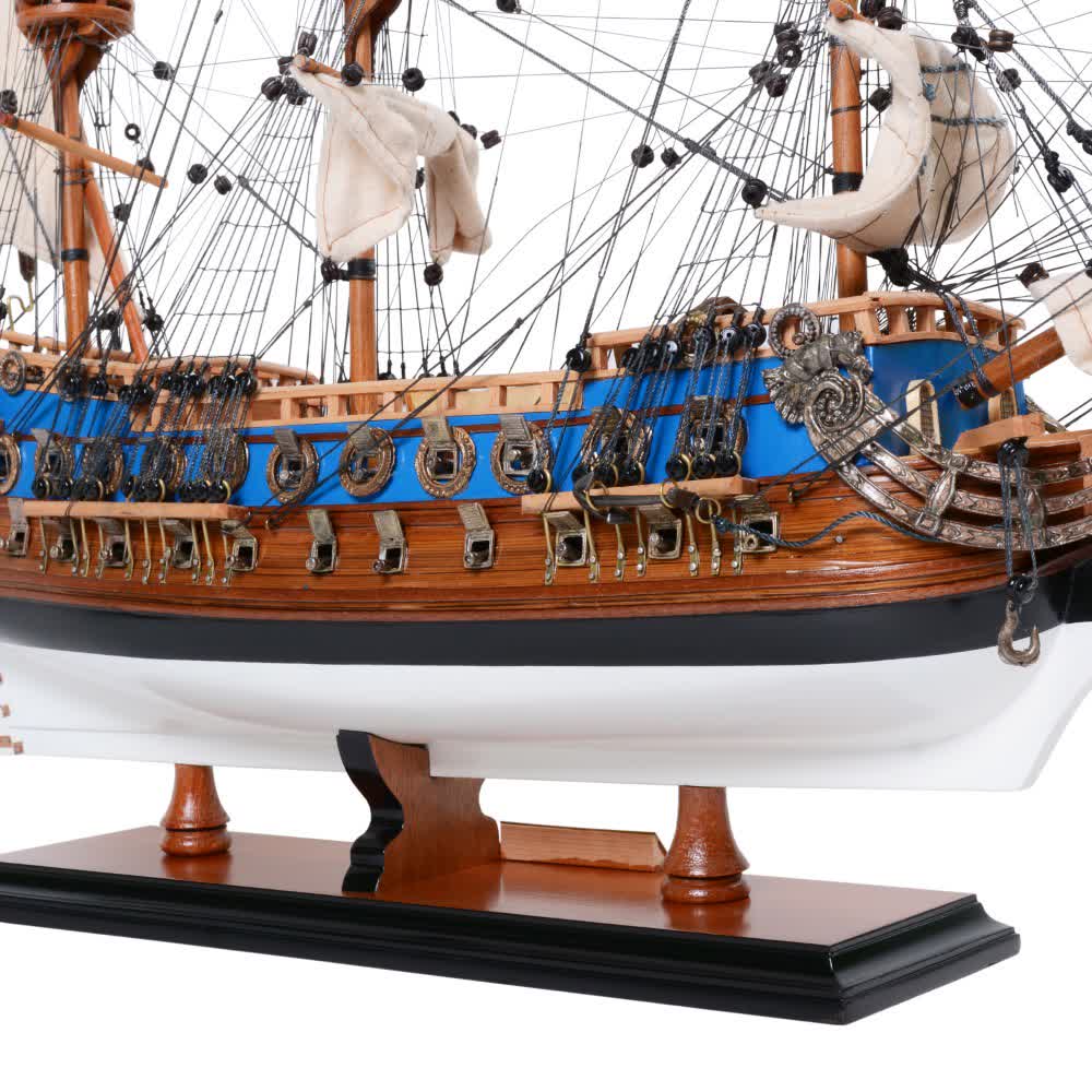 This beautiful Goto Predestination model has black, blue, and creamy off-white colors painted on the sides of the hull. It features plank on frame, three decks, and two rows of ferocious metal cannons on each side of the ship. The front bowsprit and three large masts are connected securely using advanced rigging and lines painstakingly knotted and fastened by hand. Each yard has an attached hand-stitched rolled-up sails made of fine linen. Metal anchors and a wooden rudder are visible on the front and rear of the ship. On the deck, there are metal stationed cannons, authentic hand-built lifeboats with ribs and planks, wooden cabins, wooden bell towers, wooden windlass, and many other spectacular ornaments. There is also an exquisite detailed admiral’s quarter on the stern with beautiful handcrafted metal lantern, statues of dolphins and its riders, and other unique embellishments.