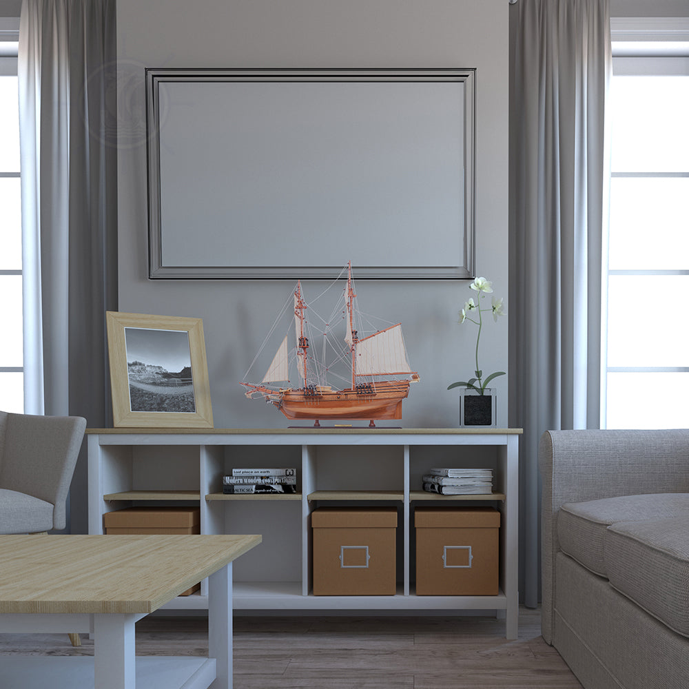 This beautiful Lady Washington model features plank on frame and two decks. The front bowsprit and two large masts are connected securely using advanced rigging and lines painstakingly knotted and fastened by hand. Each yard has an attached hand-stitched unfurled sails made of fine linen. Metal anchors and a wooden rudder with metal propeller are visible on the front and rear of the ship. On the deck, there are authentic hand-built lifeboat with ribs and planks, wooden cabin, wooden crane and many other spectacular ornaments.