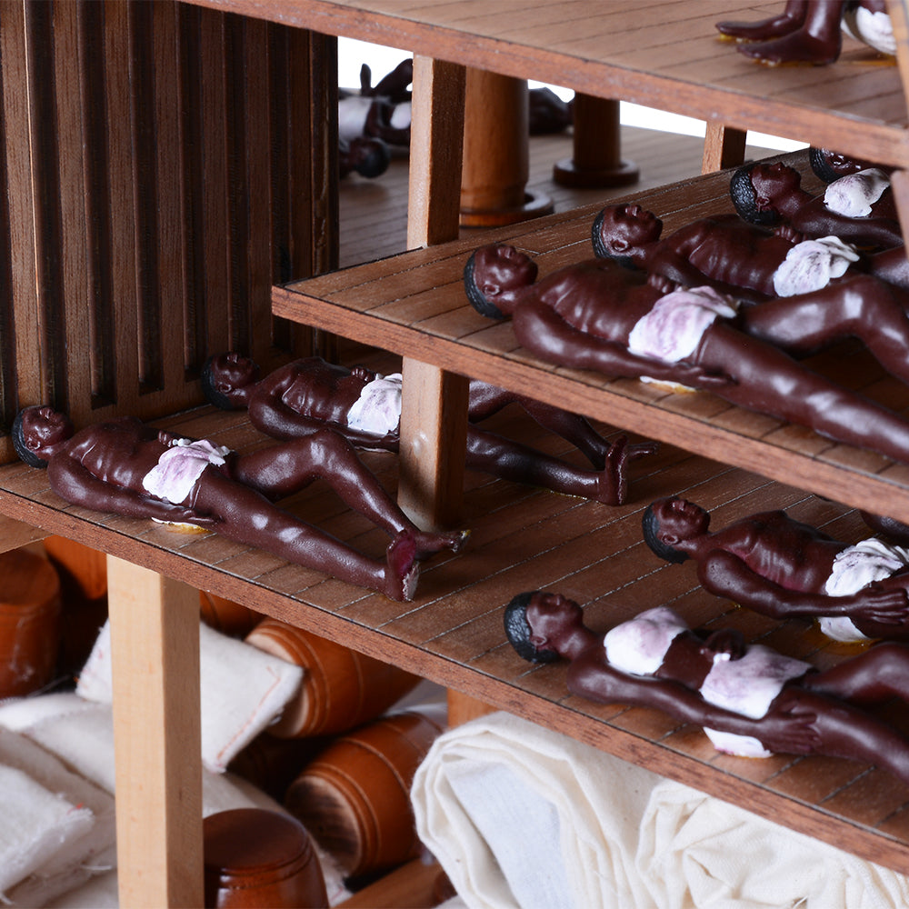 On the upper deck, miniature figures depict the enslaved individuals confined in severely restricted spaces with little room to move—reflecting the inhumane conditions they were forced to endure. Below, the lower deck shows tightly packed human forms arranged in the horrific manner historically documented on these voyages. Barrels, bundles, and trade goods are also displayed, representing the ship’s dual role in transporting both human beings and commercial cargo for colonial profit.