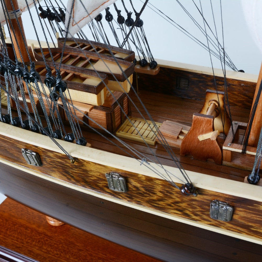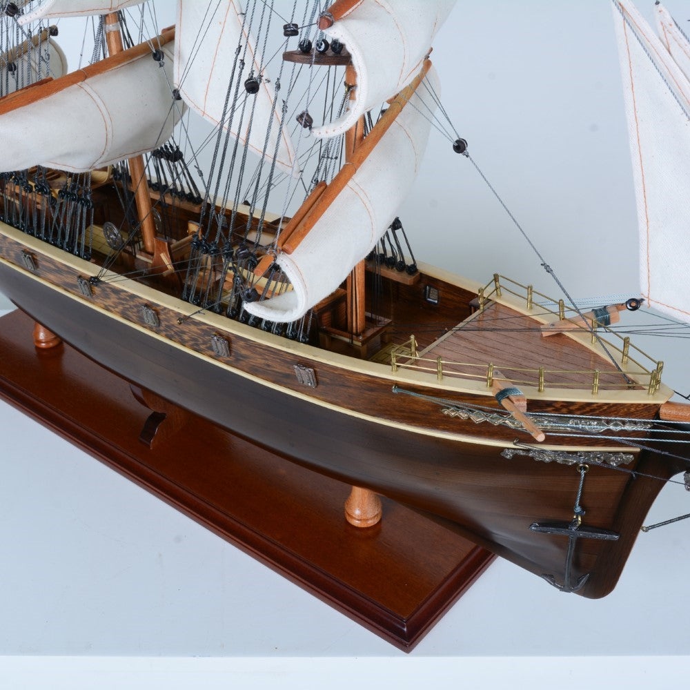 Expert craftsmen meticulously handcraft each model using historical photos, drawings, and original ship plans. Built to scale from premium woods such as Western Red Cedar, rosewood, and mahogany, every piece is constructed entirely by hand using the traditional plank-on-frame method—just like the real ships of the era. Each model takes hundreds of hours to complete and undergoes rigorous quality checks before leaving our workshop.