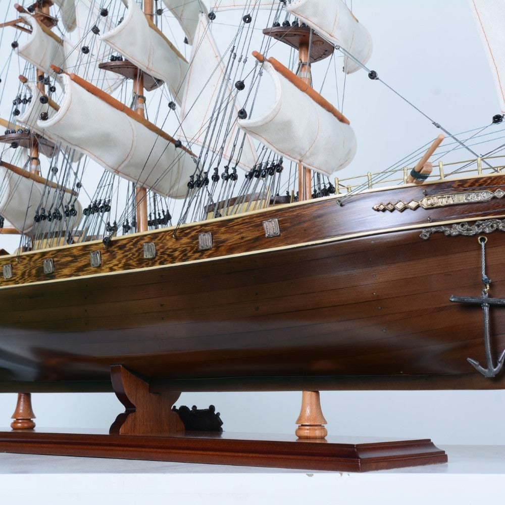 The Cutty Sark model showcases plank-on-frame construction, two detailed decks, and a row of metal portholes along each side. The bowsprit and three towering masts are fitted with intricate rigging, with every line carefully knotted by hand. Each yard proudly displays hand-stitched, rolled linen sails. Metal anchors and a wooden rudder add authenticity to the bow and stern. On deck, you’ll find handcrafted lifeboats with ribbed planking, metal steering wheels, wooden ladders and windlass, the captain’s cabin, and an array of finely detailed ornamental features.