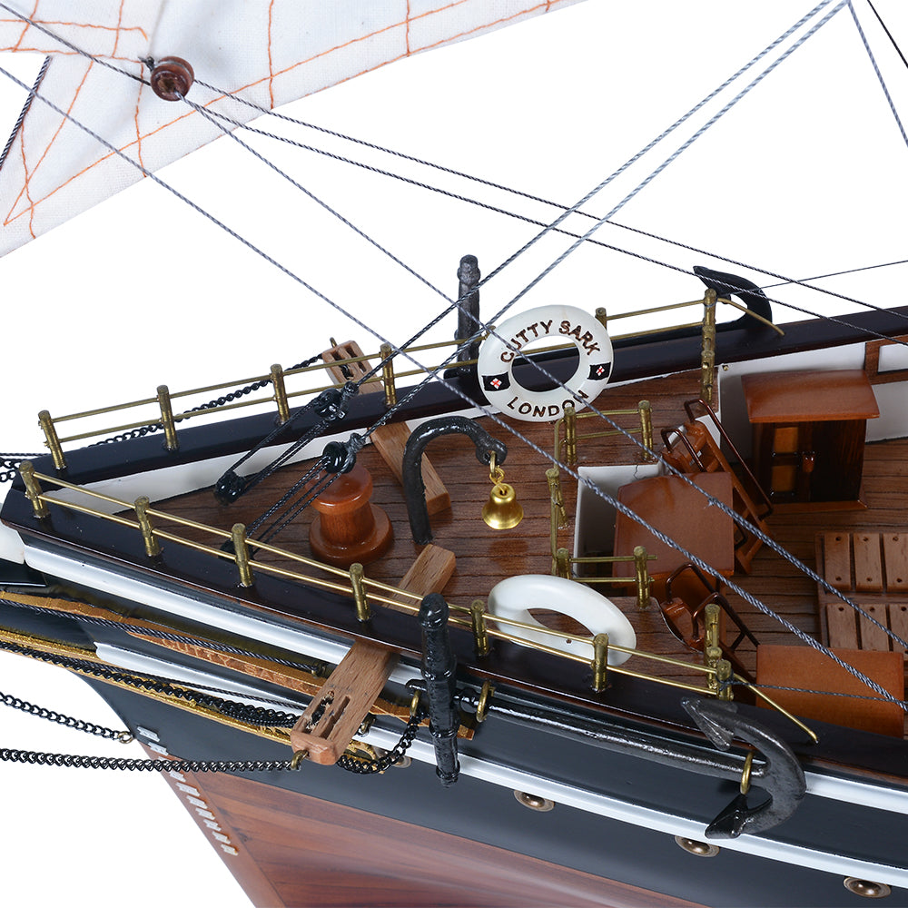 The rigging is crafted with extraordinary care. Every knot, line, and pulley is individually tied, forming a complex network of standing and running rigging that mirrors the real clipper. Hand-stitched fabric sails are mounted with precise curve and tension, capturing the aerodynamic elegance that defined the Cutty Sark’s legendary speed.