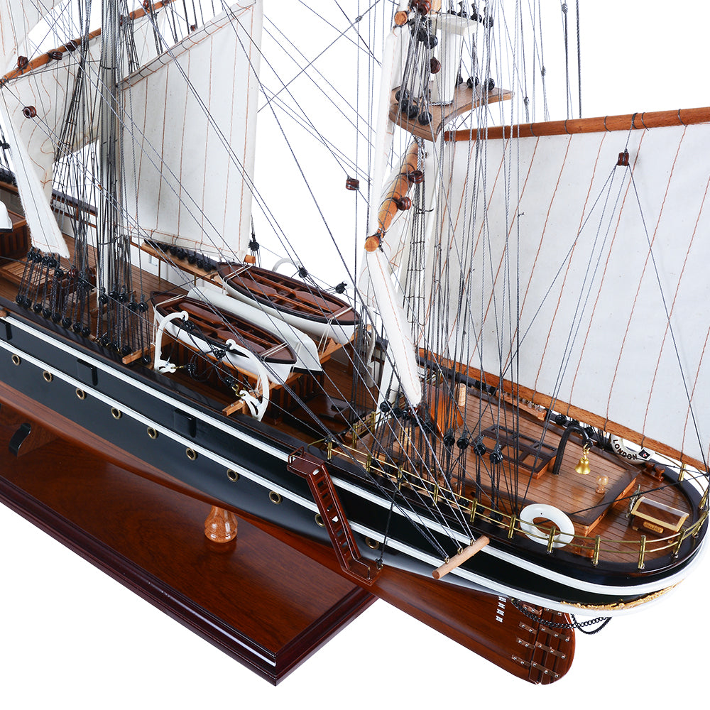 The deck is richly detailed with polished brass railings, capstans, skylights, ladders, deckhouses, and perfectly planked surfaces. Lifeboats are hand-built with tiny ribs, and fittings such as the helm, binnacle, vents, windlass, and the iconic figurehead are rendered with remarkable accuracy.