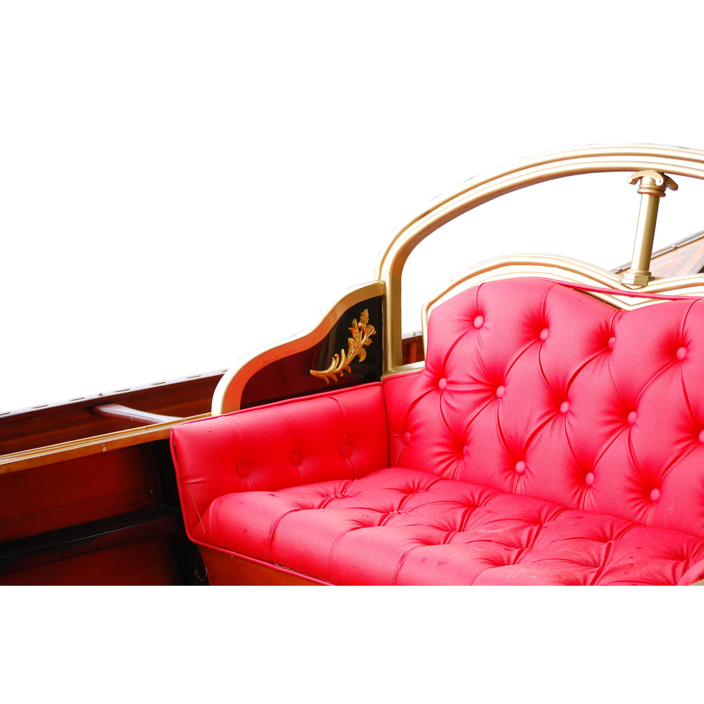 This is the REAL version of the Venetian Gondola. Fully functional at 36-feet long and beautifully painted in its original color black with white stripe. We also have a 24-feet long gondola available, upon request. This boat was completely handcrafted and takes about 600-800 hours to build. We still use the traditional method of constructions while integrating the highest quality of materials currently available. Strips of red cedars are joined together by hand and then encapsulated in fiberglass bonded in place with epoxy resin then coated with marine vanish. This combination of fiberglass and epoxy is very strong and the wood will be protected for generations. Important Note: Please be aware that this gondola is a SPECIAL ORDER item which means right after you have placed the order, it will take about 90-120 days for us to build and ship it to you.