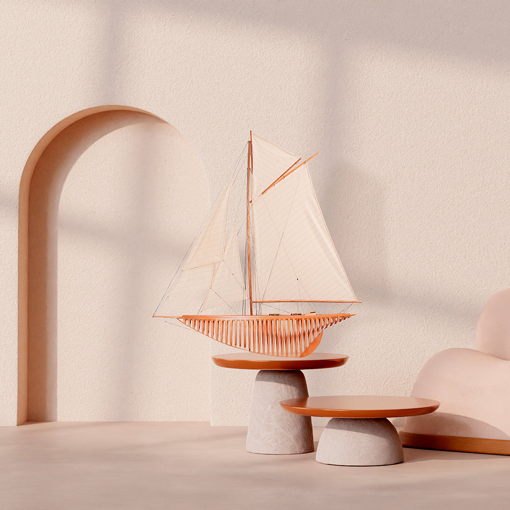 This open-hull model highlights Pen Duick’s craftsmanship through its exposed internal framework, curved ribs, and detailed plank work. Master artisans hand-build each model from scratch using premium woods such as cedar, mahogany, and teak. Constructed with the traditional plank-on-frame method, each piece requires hundreds of hours to complete and passes strict quality control before leaving the workshop.